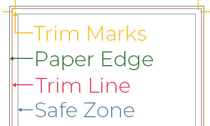 • Bleed: This is the area that extends beyond the edge of your final design. It ensures that when the paper is cut, there are no white borders or missing edges. • Cut Marks (or Trim Marks): These are small lines or markers placed at the corners of your design to show where the final cut will be made. They are essential for printers to know exactly where to trim each piece, ensuring the design is centred and consistent across copies. • Safe Zone: The area where your print will be, adjusted by a few mm for minor printing errors that may extend the trim line. | ![]() |