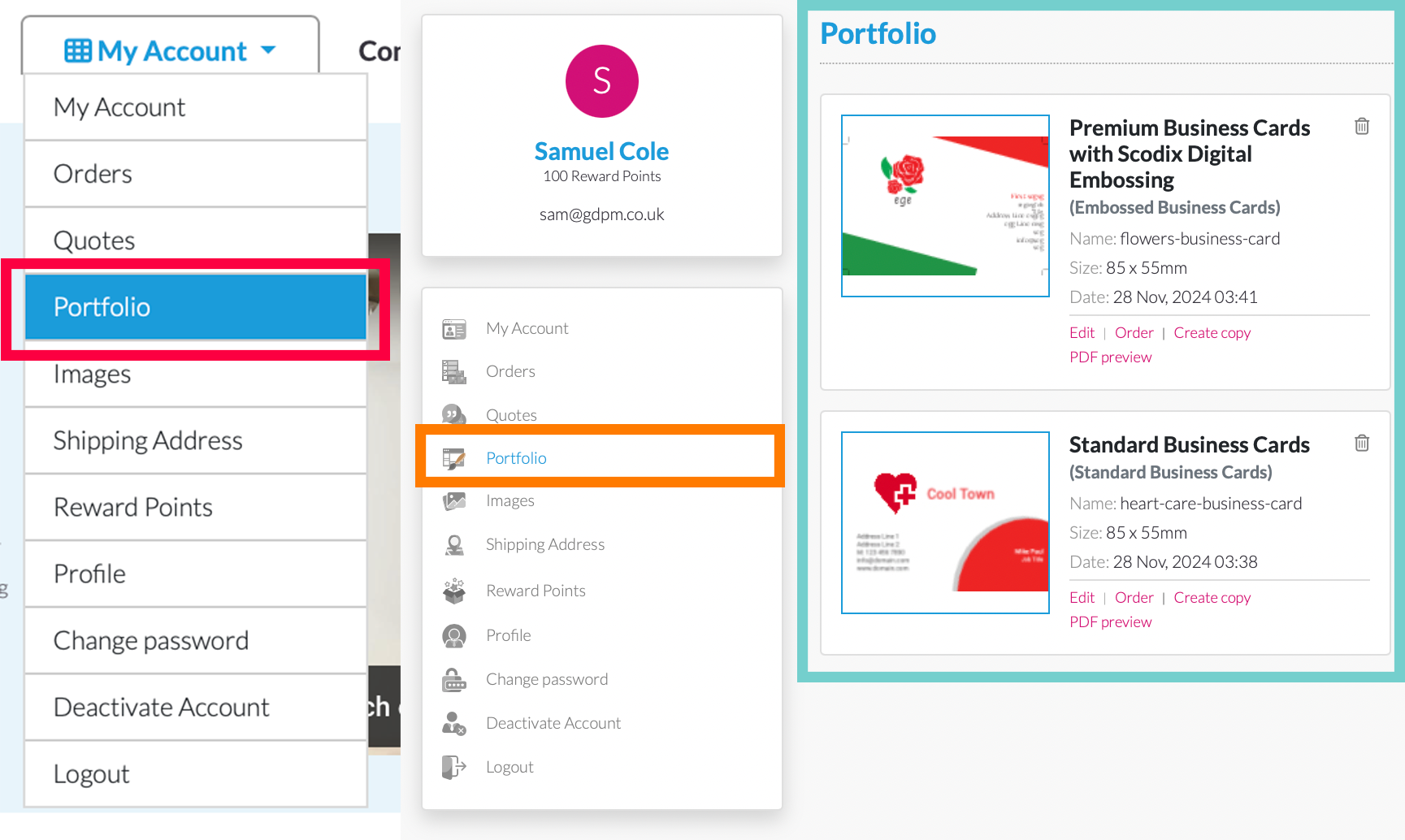 How to access and what you can do: • Click on “Portfolio”on the side navigation bar • All your saved artwork will be available here in one place • View and edit your previously saved designs • Preview your artwork as a PDF before printing • Reorder items directly from saved designs—no need to upload again | ![]() |
