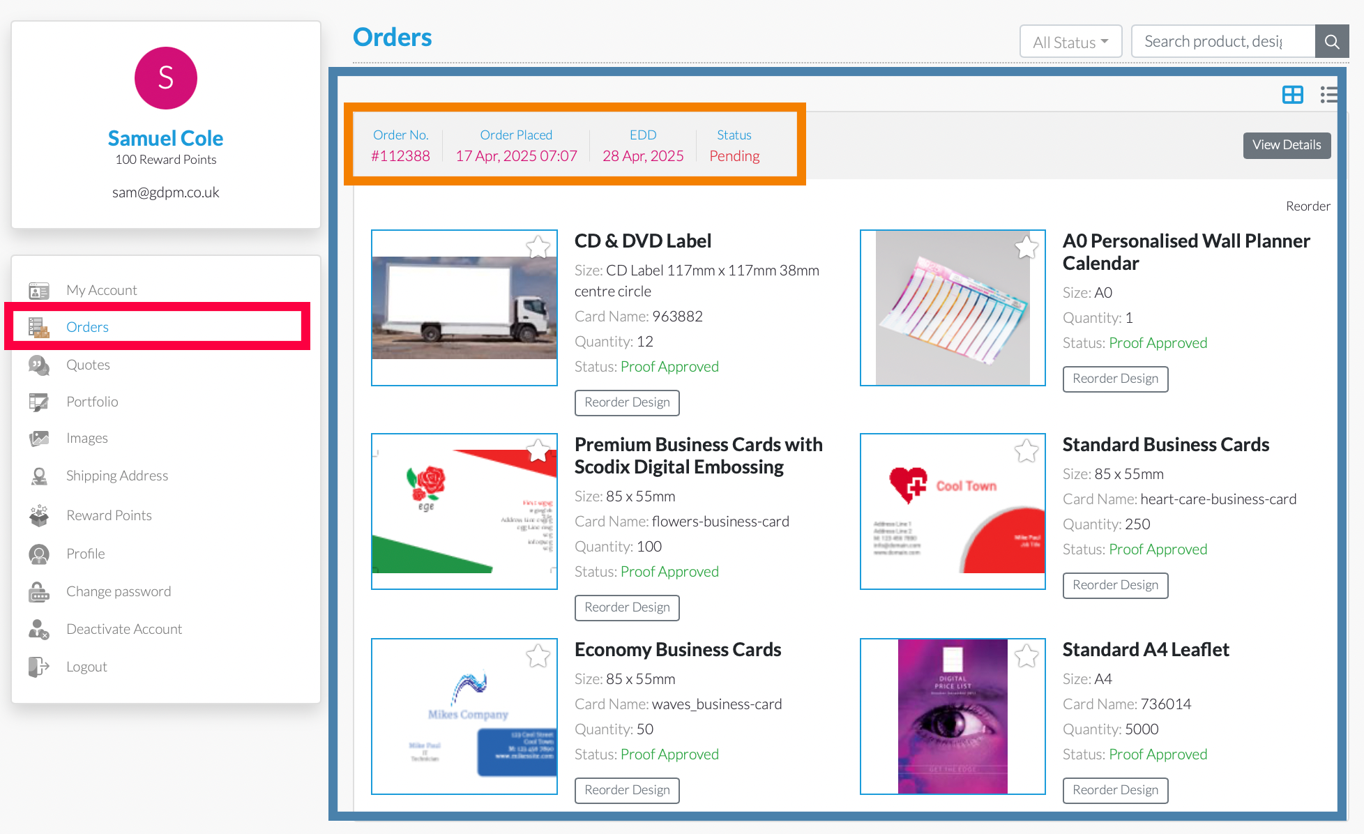 How to Access and What You Can Do on the Order Page: • Click on “Portfolio” Then select “Orders” • View order details including product name, order number, and status • View the status of each individual print • Reorder any previous job with just one click • Cancel pending orders (where available) • Track your order status in real time | ![]() |