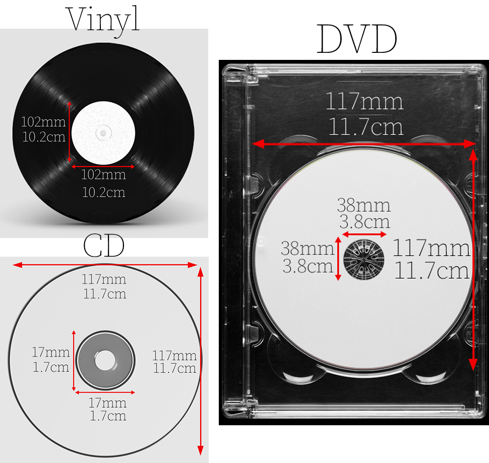 | There are small style stickers applicable to vinyls designed around the spindle hole, aimed at taking up around 1/5 of the record. Some people prefer larger labels to display more graphics, around 3/5 of the vinyl record. For CD's, the label usually takes up most of the CD, with a larger gap in the middle. This gap is about 38mm (3.8cm) and accommodates for the CD spindle hole and extra space that it needs. DVD's are usually the same but can occasionally go closer to the spindle hole. CD & DVD stickers that cover more of the disc are available if you prefer the graphic to cover more of the disc. With modern disc drives the stickers should not affect the performance, but if you use older technology the standard size for CD'd are ideal. | ![]() |